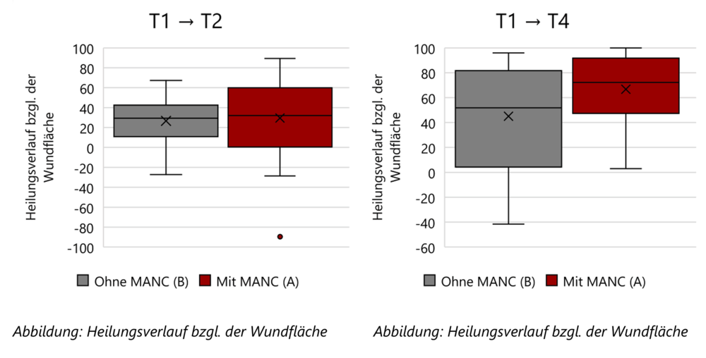 Studienergebnisse zur Entwicklung der Wundflächen zeigten, dass Wunden, welche mit MANC behandelt wurden, u.a. eine schnellere und insgesamt stärkere Reduktion der Wundflächen aufweisen. Die mit MANC behandelten Wundflächen reduzierten sich im Studienverlauf deutlich mehr, als Wundflächen unter Standardbehandlung.